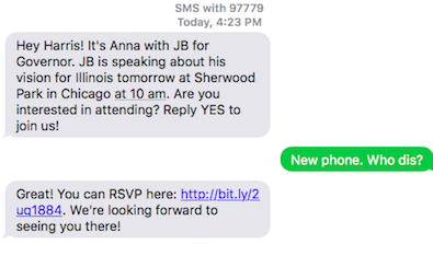 JB’s campaign was using Hustle to get me to come to an event. The idea is to use texts to allow real people to organize through one-on-one conversations. Instead, it looks like I got a bot. I wrote “new phone. who dis?” And got an instant reply with “great. RSVP here.”
