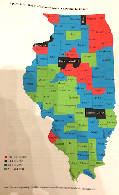 Dark red means the counties’ get back 80 cents on the dollar or less from the state. Counties shaded dark black are more break even. The blue counties are doing well and the green counties do the best, getting back at least $2 for every $1 they send to the state.