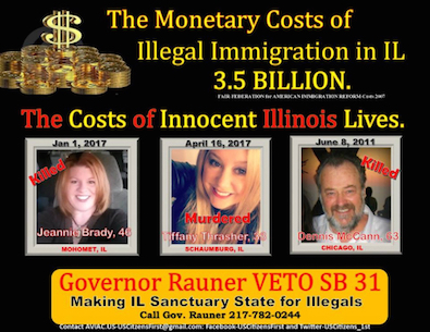 The families of these three Illinoisans that died at the hands of immigrants in American illegally have yet to hear from Governor Rauner, although he promised Fox News’ Bret Baier he would speak with them before his final action on SB 31. The deadline for action on the bill is August 29th.