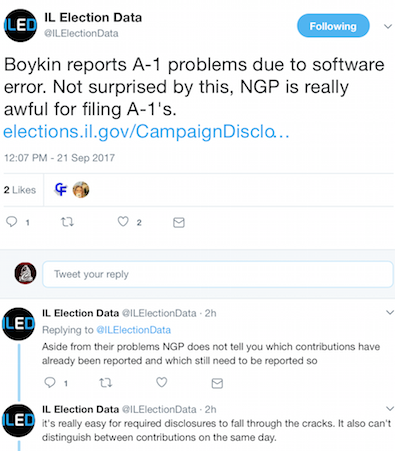 I didn’t know this until I started calling around to people about their own problems using that software (”It’s always been a pain in the a** for our people,” said one), but our old pal Dan Johnson has started a competing business to NGP called Campaign Filer. According to the website, you can file Illinois campaign finance reports for free. But he only takes Democratic clients.