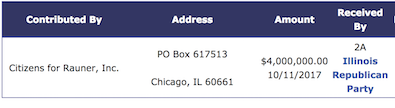 Today, the Illinois Republican Party received a $4,450,000 contribution from Governor Rauner’s campaign to launch the 2018 Madigan Retirement Plan. In total, the Illinois Republican Party has received $6.6 million from Governor Rauner’s campaign this year.