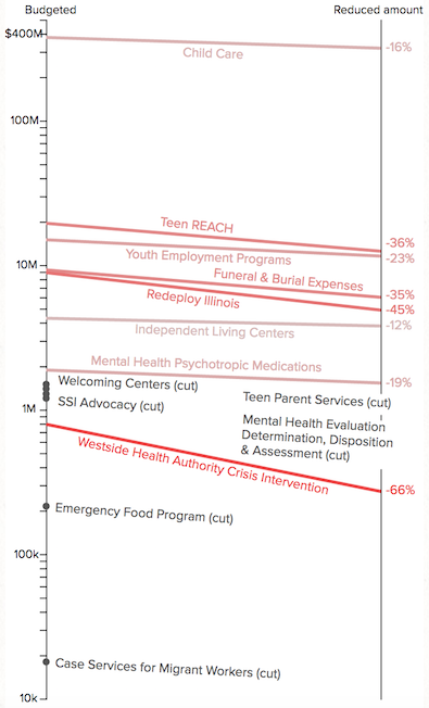 Rauner’s administration has outlined to Democratic lawmakers $89 million in spending reductions spread across 36 social service programs, one key lawmaker told the Better Government Association. The Rauner administration has confirmed some, but not all, of those cuts, arguing they are needed because the budget approved in July is badly out of balance.
