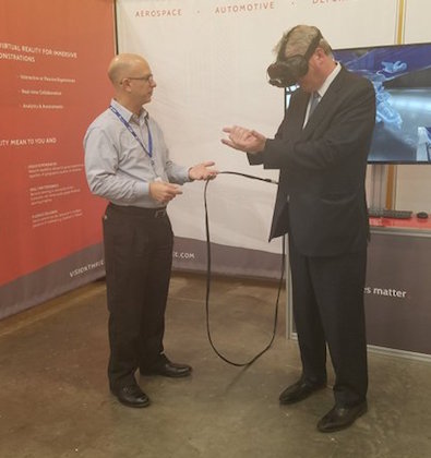 * House Republican Leader Jim Durkin tries out VisionThree’s virtual reality gear at UI LABS…