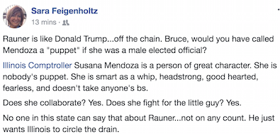 Oh to hear the all the wise ones hear who want to posit Mendoza as her own agent. You may not like Rauner but he wasn’t demeaning her gender just her independence. Of course she is working with Madigan. They have the same goal-eliminate Rauner.