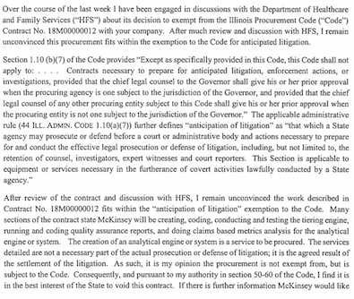 From the Update- Just because Rauner wants litigation (get rid of consent decrees, etc.) doesn’t mean he can “rig” the procurement system to try and force litigation to justify litigation. Great call-out by the CPO.