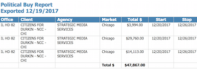 * Leader Durkin dropped another $48K on cable TV to fend off his Dan Proft-backed GOP primary opponent through Christmas…