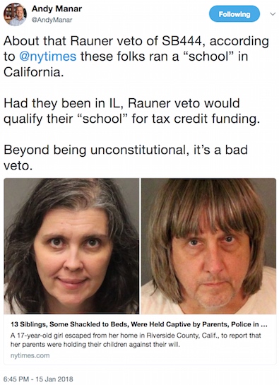 “Had they been in IL, Rauner veto would qualify their “school” for tax credit funding.”