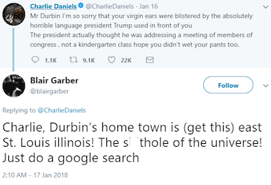 But the issue, something not understood by Charlie Daniels, Blair Garber, or anyone who would defend what Trump said: it’s not about the language, it’s about racism. Haiti, Nigeria, East St. Louis … all populated primarily by black/brown people. Norway? Not so much.