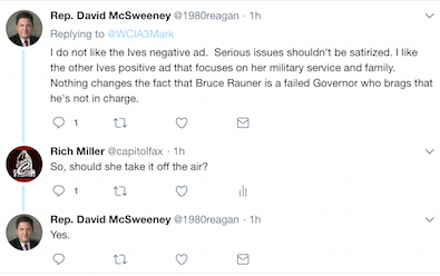 * Rep. David McSweeney endorsed his fellow Republican state Rep. Ives for governor back in January. He is a solid Ives supporter, but he now wants her to take down her new TV ad…