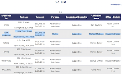 “RHA Marketing is a direct mail fundraising firm I use. A clerical person who works for my election attorney (and doesn’t know IL politics) made a data entry mistake because the direct mail fundraising letter in question mentioned Mike Madigan–as in winning the 9 seats we need in the House to depose Mike Madigan as Speaker–so she thought it was on his behalf,” he explained.