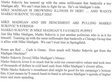 Marko Sukovic, a Republican running to replace outgoing Rep. Carol Sente, filed a lawsuit yesterday seeking injunctive and other relief in response to certain defamatory statements made in a series of mailers the [House Republican Organization] sent to Republican primary voters on behalf of Sukovic’s primary opponent Karen Feldman.