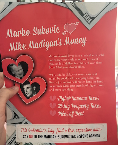 The mailers accuse her opponent, Marko Sukovic, a graduating senior at the University of Illinois with own political consulting firm, of taking “tens of thousands of dollars in cold hard cash from Mike Madigan’s closest allies.”