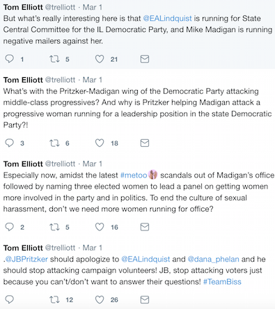 OK, I know who Elizabeth Lindquist is because I closely follow the governor’s race on Twitter. I’ve seen her appear on my bookmarked Twitter searches more times than I can count. Her Twitter page is all about Sen. Daniel Biss. She’s even wearing a Biss shirt in her profile pic.
