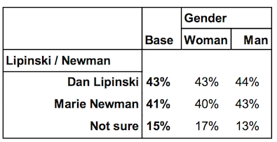 Yeah, the female cross tab is a head scratcher. If the race is a dead heat, I’d expect her to have a double digit lead among women. Virtually every penny Newman has spent has targeted women voters. At least one piece a day from Newman in my mailbox the last two weeks addressed to the women in my household. (Just one piece from Lipinski, BTW.)