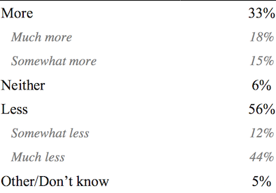85% of Democrats said less likely; 80% of Republicans said more likely while 29% of Independents said more likely and 49% said less likely.