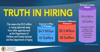 Illinois governors “offshore” their employees’ salaries to other agencies — for example, paying an education advisor $250,000 from the Department of Human Services; or a deputy chief of staff $140,000 from the Illinois State Police’s budget — to mask the true size of the Governor’s budget.