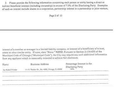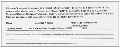 * The full version, which shows that Pritzker has a direct or indirect interest or ownership (the Pritzker campaign explains it as an indirect ownership) in excess of 7.5 percent, but doesn’t show that he is the “sole” owner as the Tribune claimed…