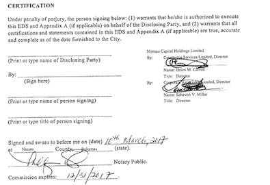 I noticed some of this when I was perusing the Tribune’s document page. So, I Googled “Moreau Capital Holdings Limited” and got the whole city filing, which you too can read by clicking here.
