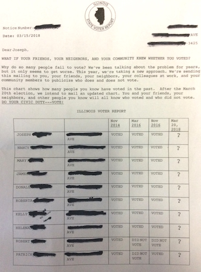 * “Voter shaming” letters were a big thing two years ago. They appear to be back and even more blatant. From a subscriber…