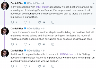 ==So, a few months ago Biss was all about pressuring Pritzker to commit to funding his own fall campaign with tens of millions of dollars. And now big money is a “cancer” on our politics.==