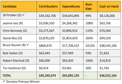 Pritzker, a billionaire Hyatt hotel heir and philanthropist, led the way by spending a record $68.3 million to win the crowded Democratic primary at a cost of $119.04 per vote. Pritzker collected more than 573,000 votes, or 45.2 percent of the ballots cast, and won by nearly 20 percentage points based on unofficial vote totals. Pritzker is self-financing his campaign.