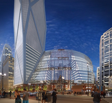 In conjunction with its annual list of endangered buildings, Landmarks Illinois has released a series of renderings that reimagines Helmut Jahn’s James R. Thompson Center with enhanced public space, while playing up its potential for adaptive re-use with an addition of a super tower.