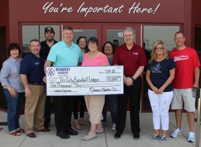 On May 10th, Midwest Members Credit Union presented the Tri-City Baseball/Softball League with a $5,000 donation to help subsidize youth athletic programs in the communities of East Alton, Roxana, Wood River, and Bethalto. The credit union has donated a total of $30,000 to the Tri-City Baseball/Softball League over the last three years, allowing the program to maintain the lowest registration fees in the area, make upgrades to uniforms and safety equipment, and make sure that anyone who wants to play baseball or softball in the summer has that chance. “We are proud of our sponsorship and relationship with the Tri-City organization and are happy to be able to make an impact with the families in the community. This is just another educational experience for them and gives them the chance to bond and create lasting relationships. Keeping active in a team-oriented environment, learning how to win and lose is something every child should have the chance to experience,” said Greg Lyons, President Midwest Members Credit Union.