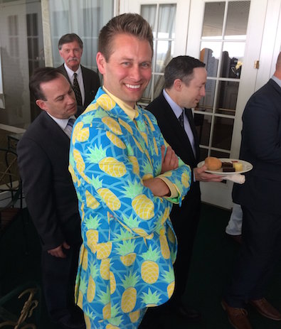 Good thing he’s on the terrace, that outfit might startle the horses!