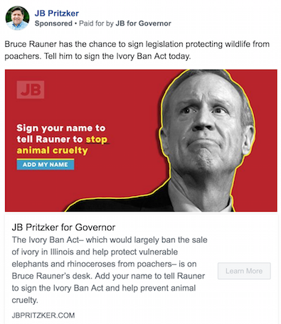 Jokes aside, this messaging is incredibly powerful among certain voters. Recall that in 2010 Bill Brady’s support of a pet euthanasia came into the main stream (it’s even on his Wikipedia page: https://en.wikipedia.org/wiki/Bill_Brady_(politician)#Animal_control). Now maybe killing household pets is not the same as poaching rhinos, but animal cruelty has a unique way of resonating with folks.