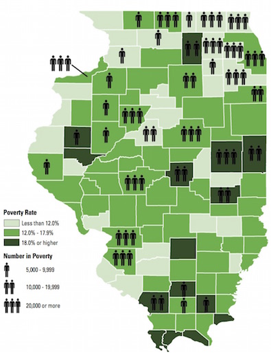 Considered an update to the organization’s poverty report issued last year, it placed 52 of Illinois’s 102 counties on a poverty watch list, up from 30 last year, while finding that almost a third of state residents are below the poverty line or considered low-income.