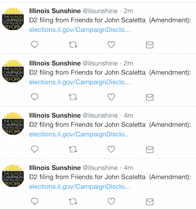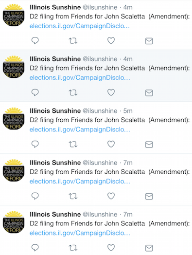 * I usually don’t bother with stuff like this, but I just couldn’t resist because it’s so weird and unusual. As of 4:08 this afternoon, Friends for John Scaletta had filed 29 amended D-2 forms. This feed caught my eye…
