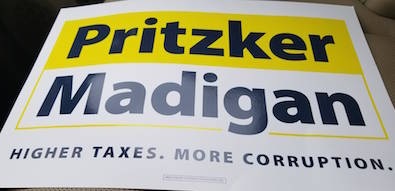 It would fit more with the theme of the day if “Pritzker” was framed within a pair of lips, and “Madigan” was contained within the outline of a human posterior, maybe with “Kish’m Tuchas” as a caption.