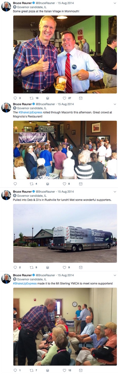 * In August of 2014, gubernatorial candidate Bruce Rauner’s “Shake Up Express” made a swing through Mt. Sterling, Rushville, Macomb and Monmouth…