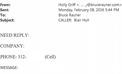 =Mr. Hull was in communication about Plaintiff’s campaign with Governor Bruce Rauner through his executive assistant, Holly Griff;=