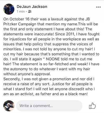 If these people are mad at the Pritzker campaign, fine. But based on what was disclosed the drafters of that complaint had no reason to be dissing DeJaun basically as a sell-out just for cutting his hair.