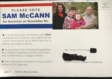 I like that the mailer points out Rauner’s pro-choice stance. In my experience, many people who consider themselves conservative and who say they support Rauner, don’t know about SB40. Sam could even frame it as Rauner and Madigan working together to allow taxpayer funded elective abortions to get more bang for his buck.