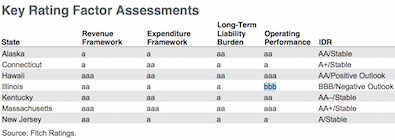 Significant governance weakness primarily distinguishes Illinois from even those other U.S. states with similarly sized long-term liability burdens. Absent the governance concerns, Illinois’ fundamental credit profile implies a rating at least one category above the current IDR.