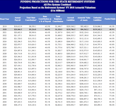 From the current fiscal year through FY2028, when unfunded liabilities finally start trending downward, the state’s annual pension payments are projected to increase a total of $2.976 billion, or an average of about $300 million a year. That’s definitely not ideal, but it’s mostly manageable.