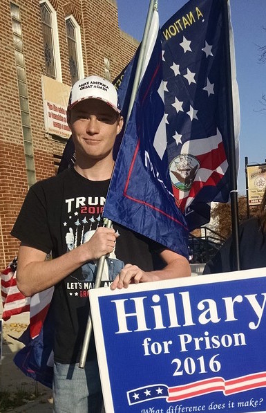 Upon arrival Tuesday afternoon, I didn’t have to search long for ardent Trump supporters. Eighteen-year-old Dave Krupa and 53-year-old Edna Bice were standing in front of a polling place at a Centro Cristiano. Krupa waved a giant Trump flag, while Bice worked with a sign reading “Hillary for prison 2016″ and a flag with a patriotic collage of stars and stripes, a bald eagle head, and military insignia. Many a passing car and semitruck honked at them in appreciation. Some people honked and flipped the bird.