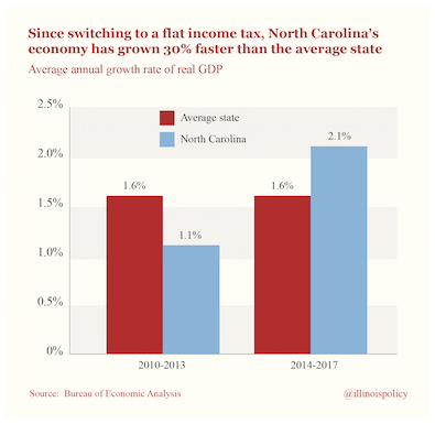 North Carolina ditched its progressive income tax in 2013 and replaced it with a flat income tax. Since then, the state’s economic growth has zoomed past the national average.