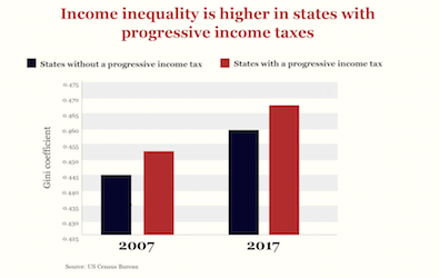 States with progressive income taxes are home to higher income inequality than states without progressive income taxes. And the gap isn’t improving. From 2007 to 2017, states with and without progressive income taxes saw inequality rise at the same rate.