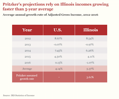Gov. J.B. Pritzker’s tax plan assumes Illinois will see average annual income growth of 3.61 percent. His administration claims this “conservative” estimate is both consistent with the state’s recent performance and accounts for a one-year stagnation in income growth to account for a slowing economy.