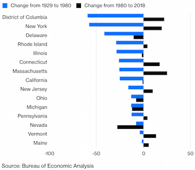 Now here are the states … that saw the biggest relative losses in per-capita income from 1929 to 1980, and what’s happened to them since:
