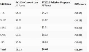 The table above compares what Illinois is required to pay to each of the five pension systems in FY2020 under current law versus the contributions that are in Governor Pritzker’s budget proposal for FY2020. To be extra clear, I’m not comparing the actuarial recommended contributions with current law (actuarial recommendation is based on 100% target in 20-30 years; Illinois law is 90% target by 2045); for a comparison like that see Figure 3 in this report).
