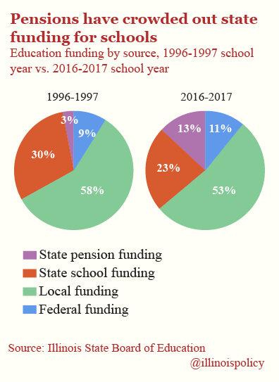 Illinois state government actually contributes a larger share of funding toward public schools today than it did 20 years ago, when factoring in pension spending. The problem is that pensions now take up more than a third of the state’s contribution to education, compared with just over 8% in the 1996 school year.