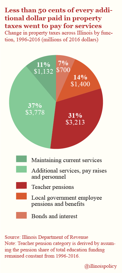 This explains why from 1996-2016, Illinoisans saw less than 50 cents of every additional property tax dollar go toward services. The primary drivers of the rise in property tax bills were pensions, other benefits and debt.