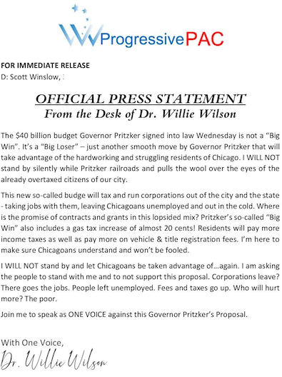 Mr. Wilson, when you misspell “Pritzker” 3 times in your flyer: 1) you can’t claim a typo, you just have to admit you don’t know the name of the governor you are admonishing, and 2) if you don’t know his name why am I supposed to trust your analysis of his policies?