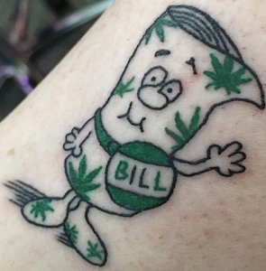 She also celebrated legalization by getting a tattoo just days ago: a cartoon of a paper bill waving hi. It features marijuana leaves and a sash that reads “bill.”