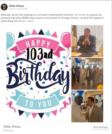 They also sent me a photo (click here) of Wilson seated next to Pritzker at the 103rd birthday party for Elizabeth Jordan in mid-June, as well as this social media post from the event…
