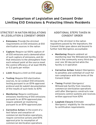 The new law contains certification requirements that currently apply to Sterigenics, but the law contains an exception. Sterigenics could have qualified for the exception if it proved to a court that the findings of the seal order were without merit. The consent order takes away Sterigenics’ ability to even make this argument in court. As a result, Sterigenics no longer has the ability to qualify for the exception to the certification requirements.